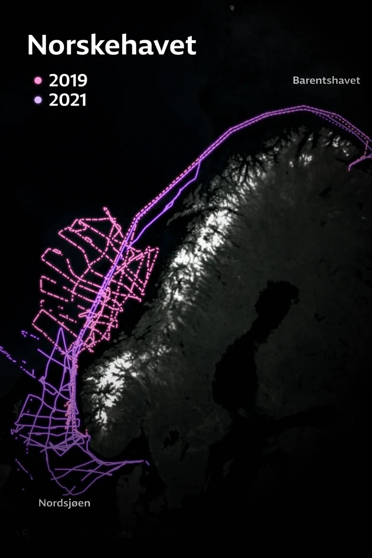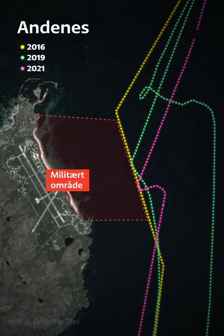 NRK's version: The lines show the tracks from a Russian fishing vessel. On Andenes in Nordland, the Norwegian Armed Forces have had a larger base for surveillance aircraft, a missile firing range and a military training area. Often with visits from the USA and other NATO allies.